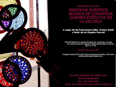 La Sec. de Extensión de la ESBA, a través del Área de Formación Continua informa los cambios de fecha y lugar del Seminario “Renovar nuestros modos de construir saberes estéticos en la escuela” A cargo de las Profs. Susana Failla, María Pascual y Viviana Martin. Adictarse en el marco del proyecto de Área de Formación Docente Continua (Dispo. Dirección Gral. De Nivel Superior CPE nº 051/13)