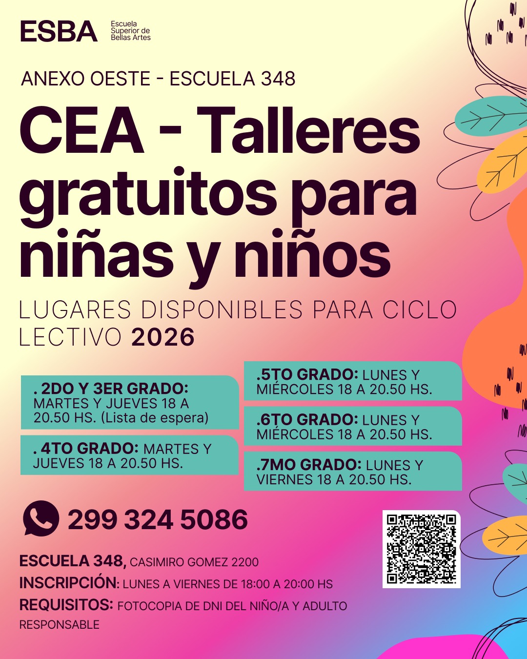 CEA: Recibe infancias a partir de 2do grado a 7mo grado y los talleres se dan a contra turno de la escuela en los horarios de 18:00 hora a 20:50 horas.