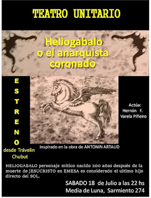Gran estreno TEATRAL desde Trevelin a Media de Luna de Neuquén. .TEATRO UNITARIO. HELIOGABALO O EL ANARQUISTA CORONADO. Inspirado en laobra de ANTONIN ARTAUD. Dice el actor Hernan F. Varela Piñeiro: esta acto es la necesidad de la escena, la búsqueda y descubrimiento del sentido en el hacer A ser. HELIOGABALO personaje mítico nacido 200 años después de la muerte de JESUCRISTO en EMESA es considerado el último hijo directo del SOL. .Antonin .Artaud lo expone en EL ANARQUISTA CORONADO iluminando y reivindicando el acto del ser humano como decisión y verdad.